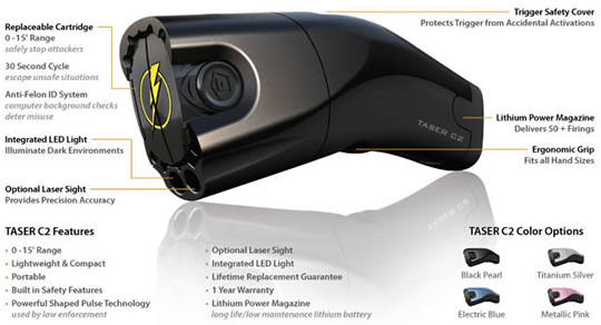 The new TASER C2 series has almost 100% effectiveness rating. It combines the injury reducing benefits of traditional stun technology with a quantum leap in stopping power via new Electro-Muscular Disruption (EMD) technology. In police studies, the new TASER C2 has a higher instant incapacitation rate than a 9mm hand gun. The TASER C2 shoots out 2 darts attached to 15 feet of wire. 50,000 volts travels over the wires and over-rides the central nervous system providing incredible takedown power.